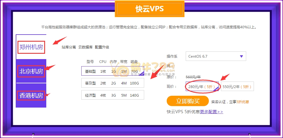 快云VPS是景安网络旗下产品,此商家促销活动较多,基本每月都有这样那样的活动,在8月、9月主机玖玖都有介绍过他们的促销VPS:景安网络快云VPS/1核1G1M/560元/2年 [截止时间2017年12月31日]。此次10月份景安网络推出了“惠在双节 5动全网”的促销活动,所以快云VPS全线5折优惠,促销机房有郑州、北京、香港;其中郑州机房最低1核1G1M带宽配置只需280元/年,此配置用户个人博客建站基本已经够用。活动促销时间:2017年10月1日-10月31日;参与用户:凡通过实名认证的新老客户。