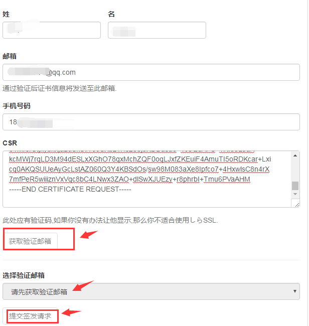 2、生成CSR文件后,点击这里进入AlphaSSL泛域名SSL证书申请页面。按下面图片所示完成操作。每天只有32个名额。