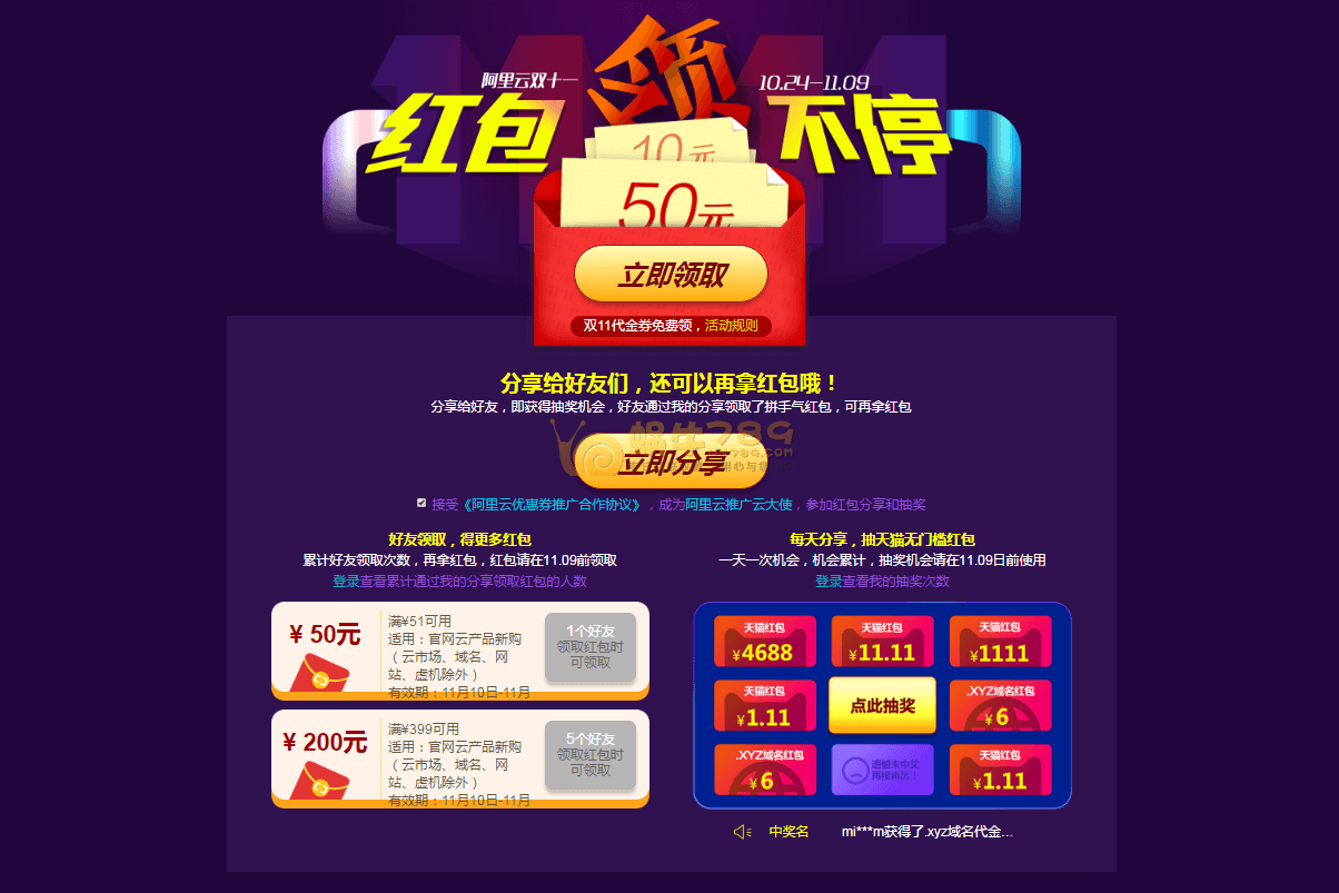 上次在阿里云国际版2017年“双11”促销 满20减10美元代金券免费领文章中介绍了阿里云国际站的双十一活动,人人都可以领取满20美元减10美元的代金券,而且分享给好友并成功领券最高可领200美元代金券。阿里云国际站发布了双11促销代金券,那国内版绝对也有福利,方式和国际版差不多,人人都可以领取10元代金券,分享给朋友最高可以领取200元代金券。