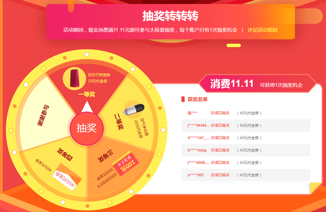 活动期间,现金消费满11.11元即可参与大转盘抽奖,每个账户只有1次抽奖机会。抽奖奖品每天限量抽取,抽完即止,奖品概不退换;一等奖(每天限量1名):京东叮咚音响+10元代金券;二等奖(每天限量11名):空气净化器+20元代金券;三等奖(每天限量111名):100元京东E卡+30元代金券;四等奖(每天限量1111名):40元代金券。