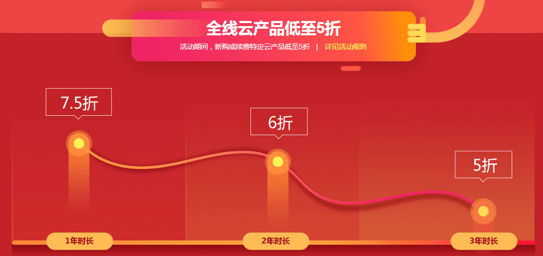 活动期间,新购或续费特定云产品低至5折。仅限现金新购或续费包年包月云服务器、公网IP、云数据库、云缓存、云硬盘及配置计费云存储产品可参加阶梯折扣活动;活动云产品仅限华南、华北、华东机房。