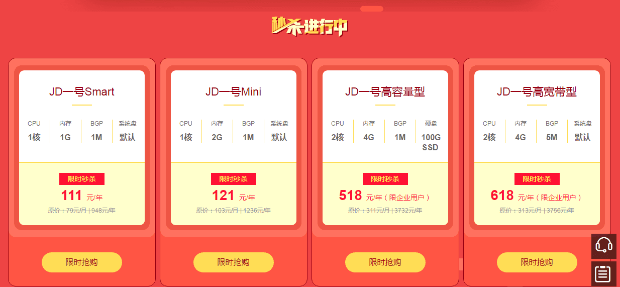 爆款云主机限时秒杀活动期间,各款秒杀产品每天限量111台,11:11开始限时秒杀(秒杀仅限新用户)。