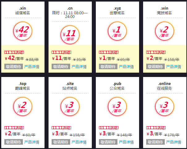 明天就是一年一度的购物双11狂欢节了,现在不仅仅是淘宝、京东及其他各大电商,现在连实体店也加入了双11的促销。虽然有些活动促销手笔大,但站长建议根据自己需求购买,切勿盲目消费。毕竟促销只是只是销售着的一个手段而且,前几年不就经常爆出先提价再打折的新闻吗。阿里云这次面对双11,也确实拿出了很大手笔,云服务器都是半价出售。虚拟主机主推独享虚拟主机,最多可以6折年付。域名首年注册最低1元起,10元之内的域名有好几个,如果你确实需要一个好的建站域名,重点推荐活动中的.cn域名,首年只需11元。其他还有.xyz=1元/首年、..win=2元/首年、.top=2元/首年、.site?.pub?.online=3元/首年,其他还有很多4-6元首年的域名就不一一例举了。