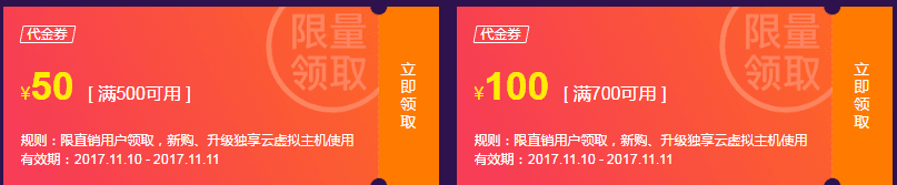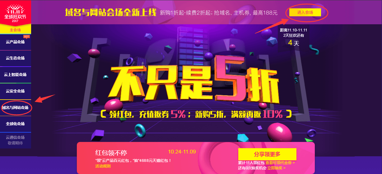 点击这里进入活动页面,然后点击下图两个红框位置中任意一个进入域名和虚拟主机活动页面。