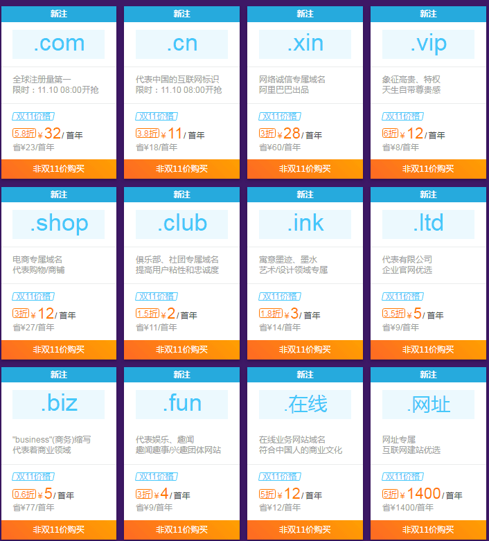 2、域名注册1折起。十多种后缀年度特价,全方位品牌保护。其中站长推荐.com(¥ 32 / 首年)、.cn(¥ 11 / 首年),时:11.10 08:00开抢。更多特价域名后缀请看下图。