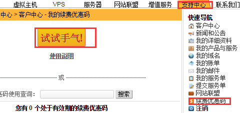 登录自己账户后,点击“支持中心”,然后再快速导航栏里选择“续费优惠码”。再点击“试试手气”。就可以抽取。