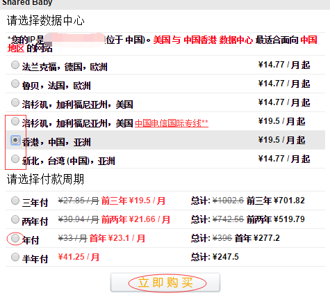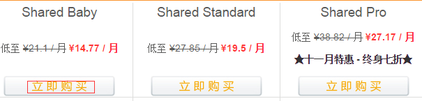普通主机有三个套餐供选择,分别是Shared Baby、Shared Standard、Shared Pro。大家根据自己需要选择。一般的个人网站Shared Baby套餐已经足够使用。选择好自己需要的套餐后,点击“立即购买”。