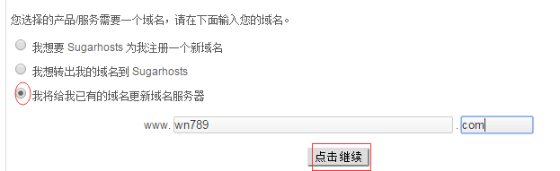 选择好主机线路及购买周期后,点击“立即购买”进入到了产品配置页面,需要你填写自己的域名或者注册一个域名。建议大家不要购买Sugarhosts的域名,太贵!!!我们选择绑定自己域名即可。如果没有域名,可以到本站免费域名板块查看相应文章选择免费域名或比较实惠的域名。