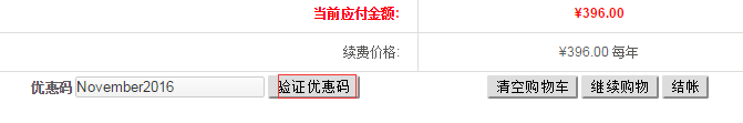 这一步进入到了订单总额页面,一般使用本站链接会自动填写上优惠码,如果没有自动填写,请在优惠码后面填写上当前可以使用的优惠码,然后点击“验证优惠码”。如果优惠码可以使用,你的当前应付金额会发生变化。然后点击“结账”进入到付款页面。