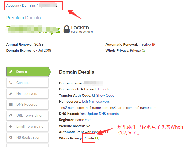 1、有些时候在Name.com注册域名时,不免费赠送Whois隐私保护,那么我们可以使用上面提供的优惠码,在域名购买后在进入域名管理页面单项购买Whois隐私保护。下图中“Whois Privacy”后面的内容显示“Private”表示站长已经购买了Whois隐私保护,并开启了保护。如果没有购买会显示“Add to Cart”,请点击“Add to Cart”购买Whois隐私保护。