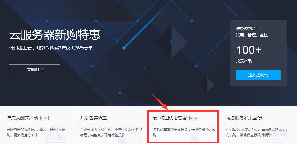 2、点击如下图中的红框位置进入“云+校园扶持计划”,或者直接点击这里进入云+校园扶持计划”。