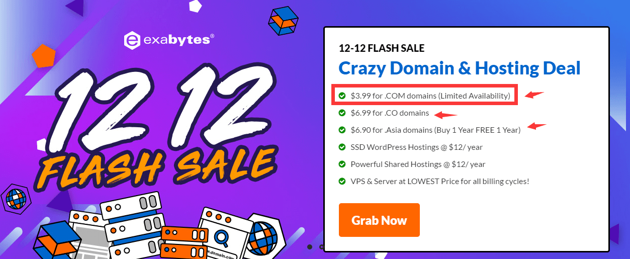 Exabytes是成立于2001年的老牌马来西亚域名商家,在站长印象中此商家经常发布.com域名的优惠活动,一般都是新注册.com域名3.99美元/首年。此次发布了“2017年双12”促销活动,新.com域名3.99美元/首年,.Co域名6.99美元,.ASIA域名买一年送一年。
