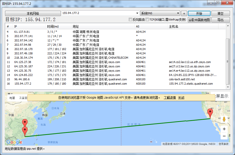 [root@10-254-110-245 ~]# mtr -rw 155.94.177.2 HOST: 10-254-110-245 Loss% Snt Last Avg Best Wrst StDev 1. ??? 100.0 10 0.0 0.0 0.0 0.0 0.0 2. 10.85.244.53 0.0% 10 0.6 0.7 0.5 1.0 0.1 3. ??? 100.0 10 0.0 0.0 0.0 0.0 0.0 4. 125.94.53.93 0.0% 10 2.0 2.5 2.0 6.3 1.4 5. 113.96.6.150 0.0% 10 7.1 5.1 1.3 9.3 3.0 6. 113.108.208.21 0.0% 10 3.0 3.2 1.4 5.2 1.2 7. 202.97.94.130 80.0% 10 2.7 2.8 2.7 2.9 0.1 8. 202.97.94.90 10.0% 10 4.2 6.8 3.6 9.8 2.4 9. 202.97.50.94 0.0% 10 162.3 162.8 161.1 165.0 1.3 10. 202.97.49.166 0.0% 10 157.3 159.2 157.3 161.1 1.2 11. xe-8-1-2.mpr1.lax12.us.zip.zayo.com 0.0% 10 204.3 201.5 194.8 206.1 3.3 12. ae14.cs2.lax112.us.eth.zayo.com 0.0% 10 205.8 203.2 197.6 206.9 2.8 13. ae27.cr2.lax112.us.zip.zayo.com 0.0% 10 216.8 213.4 207.9 216.8 2.6 14. 64.125.30.75 0.0% 10 209.5 208.9 198.2 214.4 4.9 15. 64.124.85.222.IPYX-128160-956-ZYO.zip.zayo.com 10.0% 10 189.8 197.4 185.7 207.3 7.5 16. colo-lax9.as8100.net 10.0% 10 170.2 192.1 167.0 284.6 37.8 17. 155.94.177.2.static.quadranet.com 10.0% 10 160.8 164.6 160.8 173.0 4.6