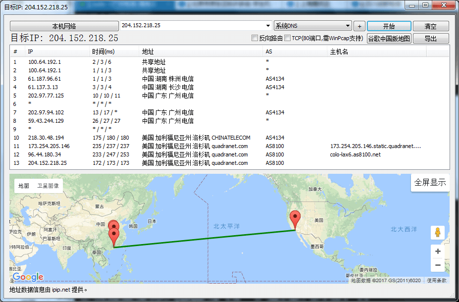 [root@VM_15_131_centos ~]# mtr -rw 204.152.218.25 Start: Sat Dec 30 14:22:07 2017 HOST: VM_15_131_centos Loss% Snt Last Avg Best Wrst StDev 1.|-- 100.104.221.129 0.0% 10 17.0 9.5 1.5 17.0 4.4 2.|-- 100.104.247.232 0.0% 10 0.8 0.8 0.7 0.9 0.0 3.|-- 10.196.28.197 60.0% 10 0.7 0.7 0.6 0.9 0.0 4.|-- 10.196.0.54 0.0% 10 5.6 5.7 5.6 5.9 0.0 5.|-- 101.226.242.29 60.0% 10 6.2 5.5 3.9 8.0 1.9 6.|-- 124.74.232.201 70.0% 10 6.7 6.7 6.6 6.8 0.0 7.|-- 101.95.207.61 0.0% 10 6.0 9.5 6.0 13.1 2.4 8.|-- 202.101.63.166 0.0% 10 5.5 7.0 5.5 8.5 0.9 9.|-- 202.97.62.226 60.0% 10 7.8 7.7 7.7 7.8 0.0 10.|-- 202.97.63.229 0.0% 10 7.6 9.0 7.1 11.1 1.3 11.|-- 59.43.244.113 0.0% 10 6.4 6.5 6.4 6.6 0.0 12.|-- 59.43.182.141 80.0% 10 146.8 146.9 146.8 147.0 0.0 13.|-- 59.43.248.105 0.0% 10 148.9 149.0 148.7 150.1 0.0 14.|-- 218.30.48.194 0.0% 10 148.0 152.8 148.0 163.0 4.6 15.|-- 173.254.205.146.static.quadranet.com 0.0% 10 162.1 162.6 162.0 163.7 0.0 16.|-- colo-lax8.as8100.net 0.0% 10 165.0 165.0 164.8 165.5 0.0 17.|-- 204.152.218.25 0.0% 10 172.0 172.1 171.8 172.8 0.0