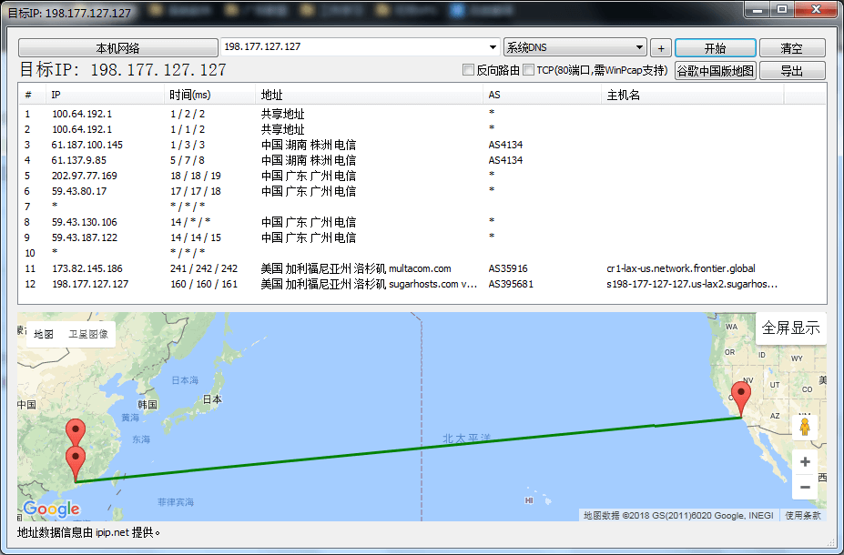 [root@VM_15_131_centos ~]# mtr -rw 198.177.127.127 Start: Thu Jan 4 21:57:30 2018 HOST: VM_15_131_centos Loss% Snt Last Avg Best Wrst StDev 1.|-- 100.104.221.130 0.0% 10 22.2 14.7 1.3 24.1 8.0 2.|-- 100.104.243.234 0.0% 10 0.8 0.8 0.7 0.9 0.0 3.|-- 10.196.28.165 70.0% 10 0.9 0.8 0.7 0.9 0.0 4.|-- 10.196.0.58 0.0% 10 3.3 3.3 3.2 3.4 0.0 5.|-- 180.163.27.209 40.0% 10 3.6 3.5 3.4 3.6 0.0 6.|-- 101.95.209.25 90.0% 10 5.3 5.3 5.3 5.3 0.0 7.|-- 101.95.207.233 0.0% 10 6.9 8.8 5.9 12.4 2.3 8.|-- 202.101.63.202 0.0% 10 9.9 8.1 6.9 9.9 0.9 9.|-- 59.43.80.85 0.0% 10 8.0 15.9 8.0 76.1 21.2 10.|-- 59.43.130.169 0.0% 10 17.5 25.7 17.5 47.2 8.2 11.|-- 59.43.138.62 90.0% 10 26.4 26.4 26.4 26.4 0.0 12.|-- 59.43.187.78 0.0% 10 7.5 10.7 6.5 21.7 5.1 13.|-- ??? 100.0 10 0.0 0.0 0.0 0.0 0.0 14.|-- 59.43.248.105 0.0% 10 160.2 160.3 160.0 162.0 0.3 15.|-- cr1-lax-us.network.frontier.global 0.0% 10 403.1 396.8 380.5 413.6 10.9 16.|-- s198-177-127-127.us-lax2.sugarhosts.net 0.0% 9 169.8 170.5 169.5 171.3 0.4