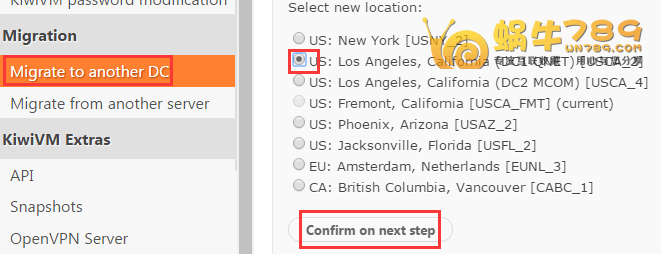 高品质美国CN2VPS免费更换IP只适合多机房切换方案,因为每切换一次机房,系统会给我们重新分配一次IP,如果担心IP被屏蔽的同学,购买时请尽量选择多机房方案。但缺点是更换机房后数据会丢失,如果是建站使用,先要想办法下载站点内容,再更换机房,所以提醒广大站长朋友一定要养成备份的好习惯。高品质美国CN2VPS免费更换IP的方法很简单,只需在控制面板进行机房切换即可。在控制面板点击“Migrate to another DC”进入机房选择页面。选择你要更改的机房,点击“Confirm on next step”进入下一步。