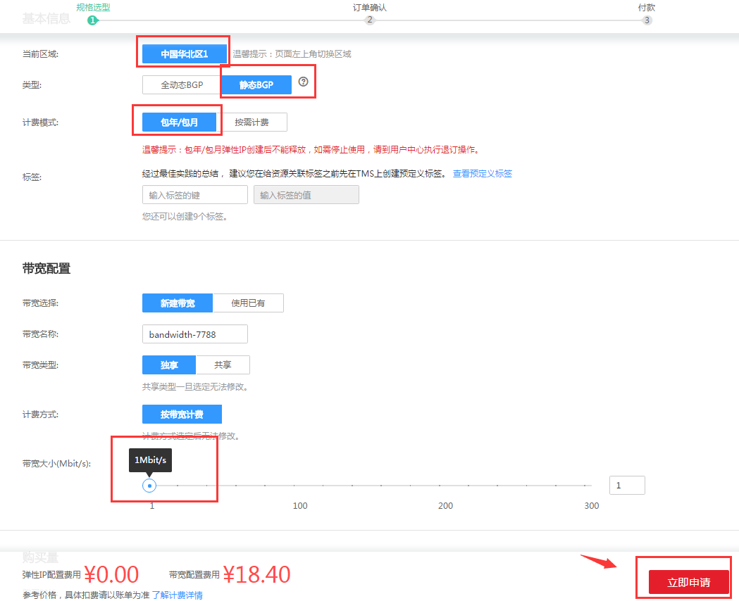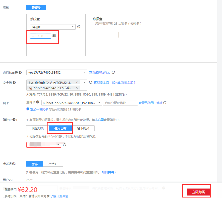 然后再进入购买云服务器页面,这里需要注意的事选择华北节点,在弹性IP栏选择“使用已有”再选择前面购买的IP。至于多余的钱我们可以用来添加硬盘大小,或改成高IO硬盘。