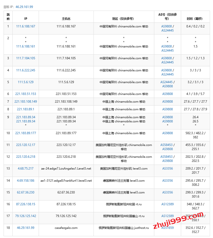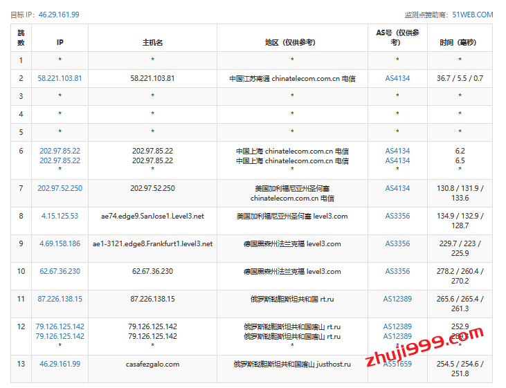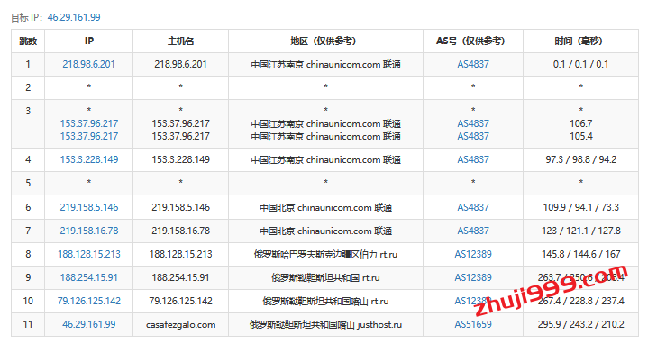 7、JustHost俄罗斯喀山VPS电信、联通、移动三网回程路由怎么样?是否直连?从回程路由追踪测试结果来看,电信联通回程不绕其他国家直接从俄罗斯到国内了,移动回程绕欧洲其他国家。