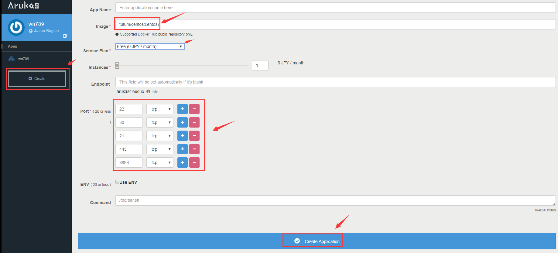 1、点击“Create”部署一个实例。在Image后面填写你要部署的镜像,站长部署的是centos7系统,所以填写的是“tutum/centos:centos7”,另外选择免费套餐。还有一个重要的环节就是端口“Port”的填写,因为是共享IP,我们在这里填写自己要用到的端口,部署完成后会自动转换到外网对应端口。站长测试是将在系统中安装宝塔面板,所有填写使用到的端口都是建站常用的,最多可以填写20个端口。填写完成后点击下面的部署按钮即可。