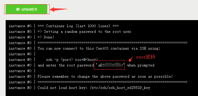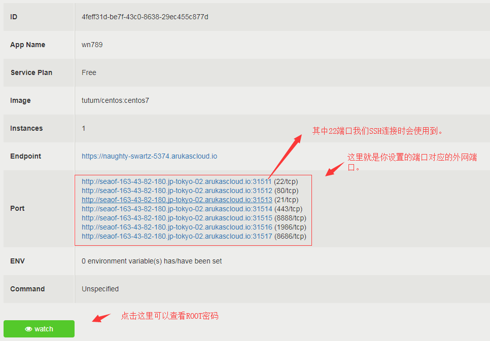 2、部署成功后,我们可以查看外网端口和root密码,如下面两个图示,例如22端口对应的是31511。