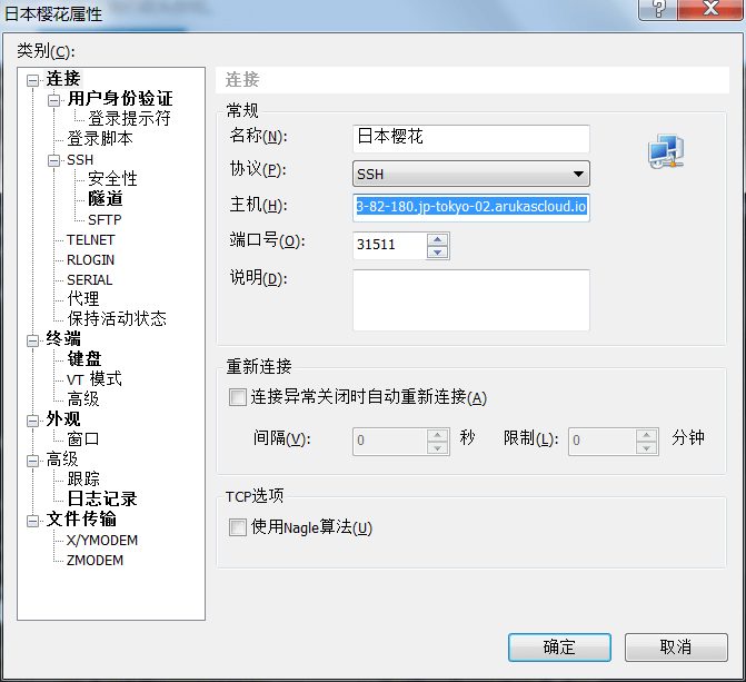 3、使用Xshell 5通过SSH端口连接对实例进行管理。我们要使用到22端口这个地址“ http://seaof-163-43-82-180.jp-tokyo-02.arukascloud.io:31511 (22/tcp)”。在下图的主机后面填写“seaof-163-43-82-180.jp-tokyo-02.arukascloud.io”记得不要“http://”,端口处填写“31511”,然后连接时输入账号root,及密码。密码在上一个步骤中教大家查看了。
