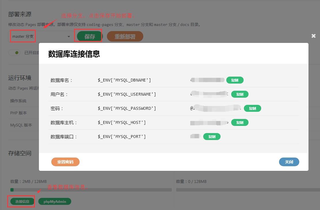 4、开启动态Pages服务后,选择“master 分支”并保存开始部署,部署完成后访问如“3c77783f-c6ef-4b73-a0b0-4d5139bc360f.coding.io”地址进行WordPress安装。关于WordPress安装,如果不会请查看此文章:如何安装WordPress来搭建个人博客。
