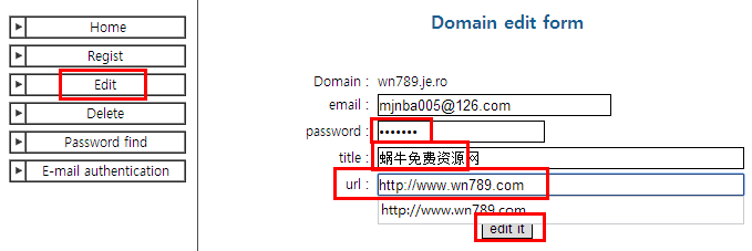 5、如果你想要修改域名转向的地址,请点击左侧的“Edit”,然后填写你的域名和密码,登录进入到域名修改页面。