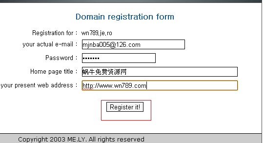 1、打开申请地址,选择好你要注册的二级域名后缀,填写要注册的域名,点击“Register it!”开始注册。