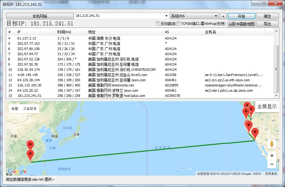 [root@YUN83123514 ~]# mtr -rw 181.215.241.51 Start: Fri Mar 30 20:14:34 2018 HOST: YUN83123514 Loss% Snt Last Avg Best Wrst StDev 1.|-- 123.249.35.65 0.0% 10 5.2 9.4 4.2 27.9 8.8 2.|-- 192.168.0.1 70.0% 10 5.1 6.8 4.2 11.2 3.7 3.|-- 219.141.127.57 10.0% 10 1.0 1.6 1.0 4.6 0.9 4.|-- 219.141.127.49 0.0% 10 2.2 2.0 1.6 2.3 0.0 5.|-- 61.189.251.250 0.0% 10 22.9 14.4 5.8 35.3 11.6 6.|-- 202.97.69.85 60.0% 10 55.2 55.7 52.9 58.6 2.3 7.|-- 202.97.94.138 20.0% 10 29.5 30.0 29.3 31.9 0.5 8.|-- 202.97.94.118 80.0% 10 54.6 54.4 54.2 54.6 0.0 9.|-- 202.97.27.238 0.0% 10 170.8 172.8 170.4 176.1 2.0 10.|-- 202.97.49.154 0.0% 10 286.1 284.7 261.2 294.1 9.2 11.|-- xe-8-3-2.edge2.sanjose3.level3.net 10.0% 10 213.1 227.3 212.2 239.1 11.0 12.|-- ae13.cs1.lax112.us.eth.zayo.com 0.0% 10 216.4 217.0 216.1 218.4 0.5 13.|-- lightspeed.bar1.sanfrancisco1.level3.net 90.0% 10 242.3 242.3 242.3 242.3 0.0 14.|-- ae27.cr1.sjc2.us.zip.zayo.com 0.0% 10 203.0 205.5 202.5 223.9 6.6 15.|-- 216-110.193.31.lsnetworks.net 0.0% 10 227.0 246.1 217.5 266.6 14.4 16.|-- 209.66.118.19.ipyx-139896-zyo.zip.zayo.com 0.0% 10 199.1 199.0 198.4 200.9 0.6 17.|-- 181.215.241.51 0.0% 9 220.6 237.5 214.9 249.0 12.7