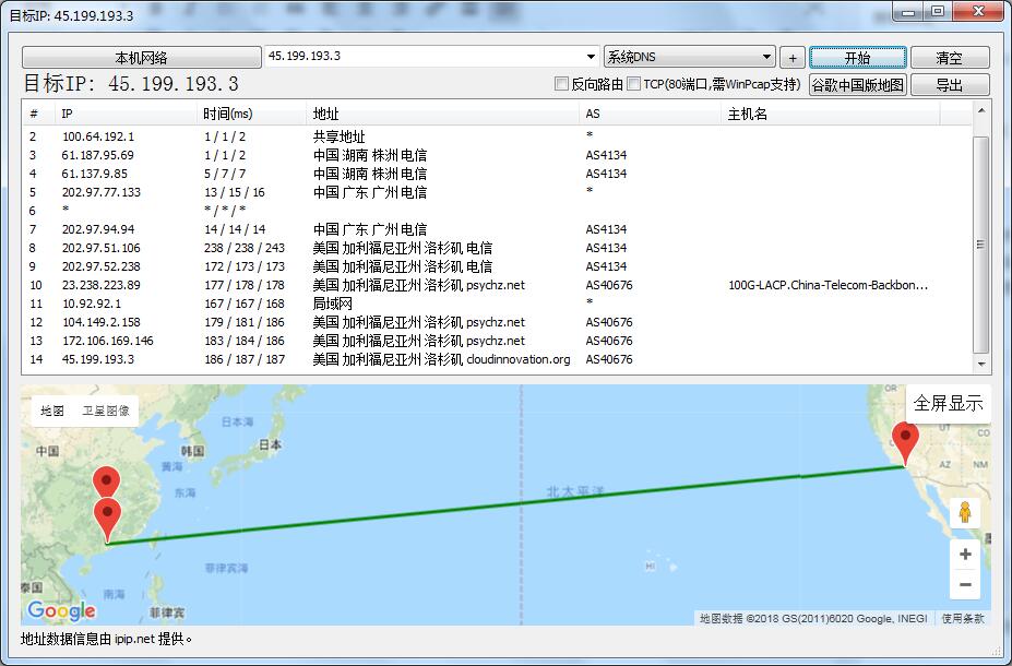 [root@jdu4e00u53f7 ~]# mtr -rw 45.199.193.3 Start: Sun Apr 8 13:44:05 2018 HOST: jdu4e00u53f7 Loss% Snt Last Avg Best Wrst StDev 1.|-- ??? 100.0 10 0.0 0.0 0.0 0.0 0.0 2.|-- ??? 100.0 10 0.0 0.0 0.0 0.0 0.0 3.|-- 100.127.3.121 0.0% 10 0.8 1.6 0.7 7.0 1.8 4.|-- 100.127.203.17 0.0% 10 3.0 3.1 1.9 6.3 1.2 5.|-- 100.127.125.82 0.0% 10 2.2 3.5 2.2 6.0 1.4 6.|-- 180.149.137.117 0.0% 10 5.0 16.6 4.1 45.7 16.6 7.|-- 180.149.159.17 0.0% 10 2.7 2.6 2.5 2.8 0.0 8.|-- 180.149.128.41 0.0% 10 5.0 4.8 3.3 6.0 0.9 9.|-- 202.97.34.158 30.0% 10 3.6 3.9 3.6 5.4 0.4 10.|-- 202.97.81.174 0.0% 10 4.0 5.6 4.0 6.9 0.7 11.|-- 202.97.90.238 0.0% 10 186.3 185.0 183.2 186.4 0.9 12.|-- 202.97.52.246 0.0% 10 167.9 167.9 167.6 169.8 0.5 13.|-- 100G-LACP.China-Telecom-Backbone.lax.us.AS40676.net 0.0% 10 203.3 190.4 169.2 204.3 10.8 14.|-- ??? 100.0 10 0.0 0.0 0.0 0.0 0.0 15.|-- 104.149.2.158 0.0% 10 192.8 197.3 192.5 204.2 3.8 16.|-- 172.106.169.146 0.0% 10 184.4 184.4 184.3 184.6 0.0 17.|-- 45.199.193.3 0.0% 10 183.3 183.3 183.3 183.5 0.0