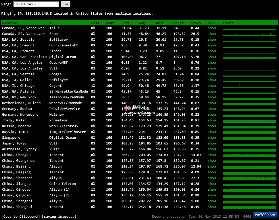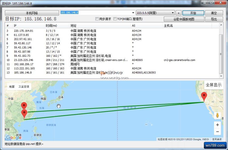 | 13 | 59.43.189.34 | 59.43.189.34 | 美国加利福尼亚州洛杉矶 电信 | 136.1 / 136.1 / 136.4 | |