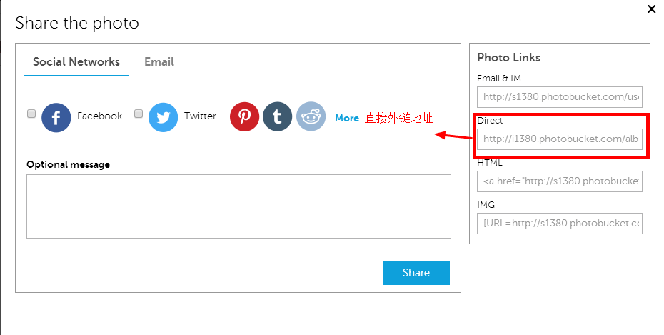 7、点击“Share”后,弹出如下页面。我们根据需要选择分享地址,第二个为直接外链地址。