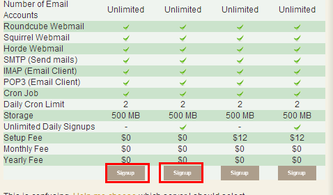 2、进入到注册页面后,我们首先选择套餐,有两个免费的供选择,其中Stevie套餐的免费空间支持PHP语言,Johnny套餐免费空间支持ASP.NET。大家根据自己需要选择,下图中第一个红框为Stevie套餐,第二个为Johnny套餐。选择想要的套餐后点击”Signup“注册。