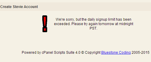 由于Stevie套餐免费空间每天开通限制了名额,如果我们选择Stevie套餐,点击”Signup“注册后弹出如下图页面表示今天注册名额已经用完,明天再来申请。