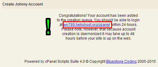 4、点击”Create Account“按钮完成注册后,如果显示如下页面,表示注册成功,你的账号进入了审核开通排队,一般在24小时内完成,也有可能需要48小时,请耐心等待吧。如果你的”XXXX.heliohost.org/cpanel“控制面包地址可以访问了,证明空间已经开通。