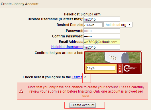 3、站长在做演示站点过程当中提示了Stevie套餐名额已经使用完,就换选了Johnny套餐为大家做教程。在Johnny套餐下点击”Signup“后,弹出填写注册信息页面,表示可以注册。我们按要求填写注册信息,依次是:理想的用户名、二级域名、密码、确认密码、邮箱、helionet用户名、填写验证码(如果验证码没有显示,建议使用国外IP)、最后勾选服务条款,填写好后点击”Create Account“按钮完成注册。