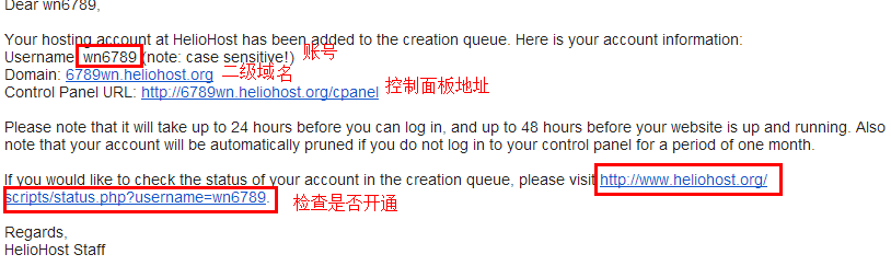 5、你的注册邮箱会收到一封邮件,我们打开查看,里面有注册信息及二级域名,还有控制面包登陆地址,最后一个链接是检测是否开通的。