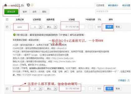 7、知道IP地址之后我们就到DNSPod进行解析。首先我们点击需要解析的域名,进入到下图添加记录页面,然后添加解析记录。