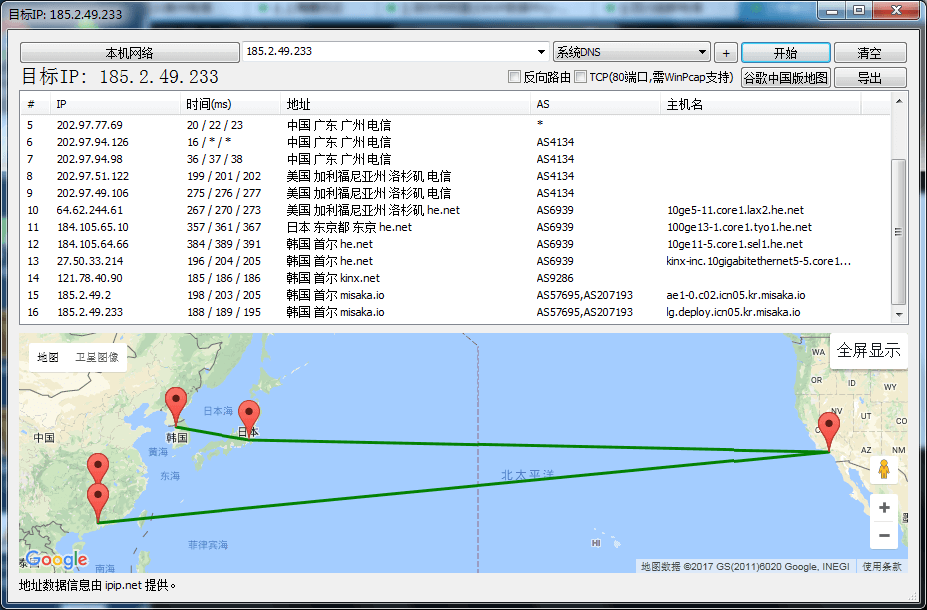 [root@DAIMIYUN20171126805 ~]# mtr -rw 185.2.49.233 Start: Thu Dec 28 23:03:40 2017 HOST: DAIMIYUN20171126805 Loss% Snt Last Avg Best Wrst StDev 1.|-- gateway 0.0% 10 33.1 7.4 3.8 33.1 9.1 2.|-- 192.168.0.1 90.0% 10 3.3 3.3 3.3 3.3 0.0 3.|-- 172.16.0.1 0.0% 10 1.1 1.2 1.1 1.9 0.0 4.|-- 219.141.127.57 0.0% 10 1.0 2.5 1.0 15.5 4.5 5.|-- 219.141.127.49 0.0% 10 1.7 1.9 1.6 2.2 0.0 6.|-- 61.189.251.109 0.0% 10 8.1 8.4 8.1 9.7 0.3 7.|-- 202.97.69.85 0.0% 10 56.7 55.2 51.9 58.8 2.2 8.|-- 202.97.94.146 90.0% 10 29.4 29.4 29.4 29.4 0.0 9.|-- 202.97.94.118 60.0% 10 30.0 30.0 30.0 30.0 0.0 10.|-- 202.97.58.230 0.0% 10 265.5 269.2 265.5 271.9 1.9 11.|-- 202.97.50.26 0.0% 10 228.3 225.1 220.7 229.0 2.7 12.|-- 10ge5-11.core1.lax2.he.net 0.0% 10 256.6 251.8 241.9 261.0 6.5 13.|-- 100ge13-1.core1.tyo1.he.net 0.0% 10 406.0 400.1 395.5 406.0 2.6 14.|-- 10ge11-5.core1.sel1.he.net 0.0% 10 371.3 359.6 350.2 371.3 6.8 15.|-- kinx-inc.10gigabitethernet5-5.core1.sel1.he.net 0.0% 10 240.0 239.8 230.1 255.0 8.0 16.|-- 121.78.40.90 0.0% 10 222.7 222.6 222.4 222.7 0.0 17.|-- ae1-0.c02.icn05.kr.misaka.io 0.0% 9 271.1 271.3 268.9 276.7 2.8 18.|-- lg.deploy.icn05.kr.misaka.io 0.0% 9 271.7 263.1 234.4 274.9 15.6