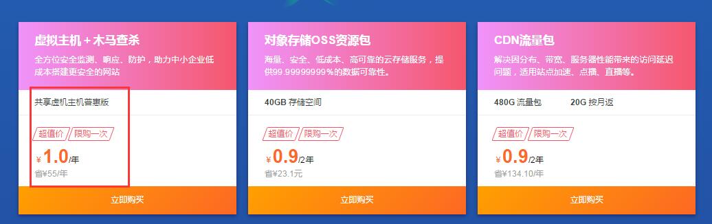 关于阿里云2018新年感恩大回馈活动,站长曾在阿里云2018新年感恩大回馈 OSS资源包/CDN流量包0.9元/2年文章介绍过一次,但是当时并没有1元购共享虚拟主机基础版的活动,可能是后期增加的。虽然阿里云共享虚拟主机基础版配置不高,只有1C磁盘10G月流量,但是对于新接触建站的朋友试试手是非常不错的,由于虚拟主节点是国内节点,如果你有域名要稳定,可以使用1元购买的共享虚拟主机进行域名稳定。另外提示下活动时间是从2月1日到2月28日,只有几天时间了,需要的别错过了。