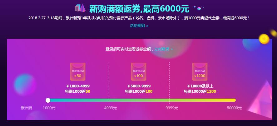 一般新接触阿里云的朋友都可以廉价购买到高品质的云服务器,但以上的活动如果都参与了,以后想要购买新的服务器,是不是阿里云就没有什么活动了呢?除了以上活动外,阿里云经常发布一些促销活动也还是非常给力的,比如此次农历新年过后,阿里云开启了“IT采购开年惠,百款产品5折起,新购满额再返最高6000”活动,云服务器新购五折优惠起,并且活动期间累计消费满1000元就返代金券,最高可以返6000元。