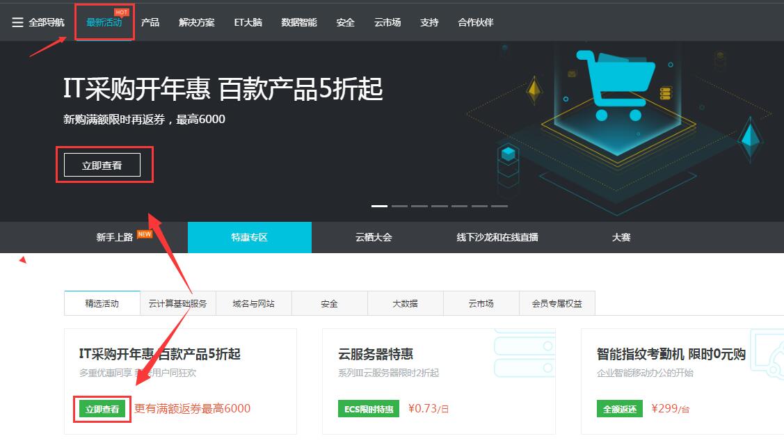 如何进入活动页面?点击上面的购买地址进入阿里云全民云计算活动页面,点击“最新活动”再进入IT采购开年惠活动。