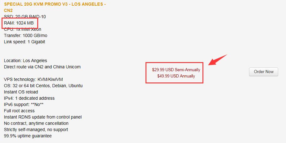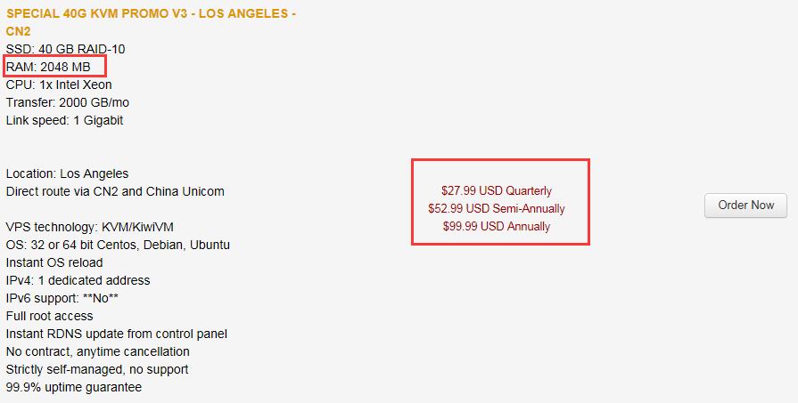 在高品质美国CN2512M低内存VPS全线断货的这段时间里,高品质美国CN2还对2G内存以下套餐的付款周期做出了调整,目前所有1G内存套餐只有半年付款和1年付款的周期可以选择;其中1G内存的洛杉矶独立机房KVM VPS,也就是目前支持CN2直连的QN机房只有年付周期可以选择。月、季度付款周期也不存在了。