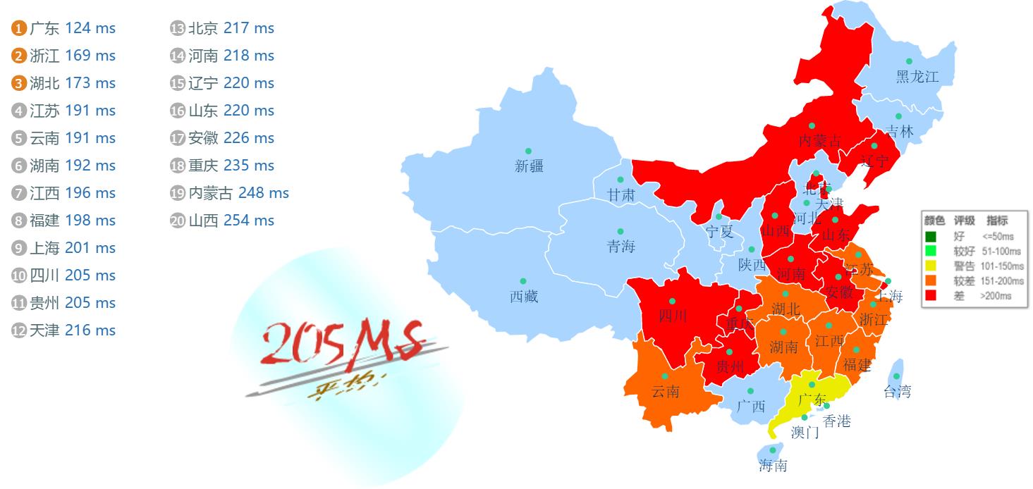 | 西南地区 | 6 | 重庆电信 180.3 毫秒 | 贵州兴义电信 218.4 毫秒 | 196.3 毫秒 |