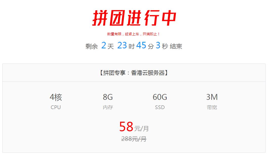 尊云是一个来自国内的主机销售商,与宝塔面板有合作关系,此次商家推出了一个和腾讯云差不多的拼团活动,不过尊云针对的是香港云服务器,配置还挺高哦,4核CPU、8G内存、60G SSD、3M带宽,通过拼团活动购买只需58元/月,首月到期后可以半价144元/月续费三个月,之后就会恢复288元/月。比较适合短期需要香港云服务器的朋友,另外想体验下高配的朋友也可试试。