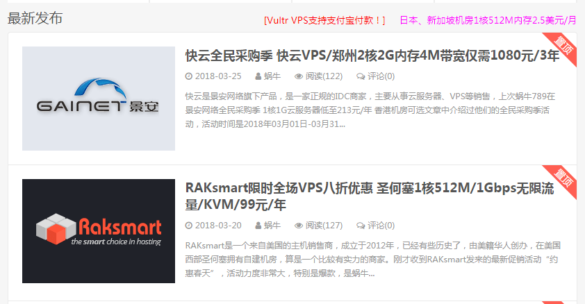 上次在为DUX主题4.0以前版本添加首页显示置顶文章功能文章分享了一个转自@蝈蝈要安静的设置方法,那是基于官方4.0以上的版本提取的。其实在2018年农历新年年初,站长也找一个朋友做过DUX主题的修改,也是想实现在DUX主题最新发布前显示顶置文章,并且支持设置只显示指定分类目录顶置文章。但代码也有不完善的地方,有需要的朋友可以试试,具体显示效果如下: