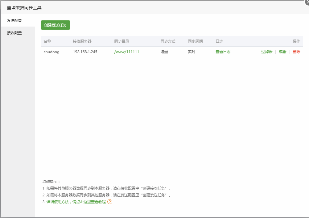 2、宝塔数据同步工具。通过此工具可以实现网站数据的同步、做数据镜像、数据备份或指定文件实时同步等功能。支持实时同步(实时监控文件与目录状态,一但有变更,立即执行同步任务)、定时同步(每隔一段时间去扫描文件与目录是否有变更,在扫描到有变更时执行同步任务);增量同步(数据更改/增加时同步,且只追加和替换文件)、完全同步(保持两端的数据与目录结构的一致性,会同步删除、追加和替换文件和目录)。详情可以点击这里查看宝塔官方介绍。