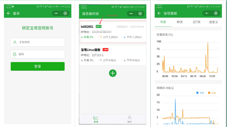 1、微信小程序。可以关联绑定多台服务器,单台服务器也可以授权多个微信用户绑定,拥有服务器监控功能以及安全扫码登录面板功能,方便用户随时查看服务器状态,后续会逐渐增加更多的面板管理功能,敬请关注。详情可以点击这里查看宝塔官方介绍。