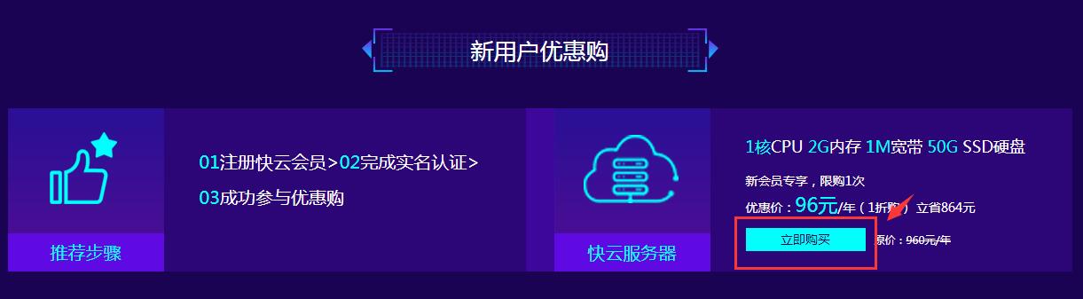 点击上面购买地址进入活动页面,点击如下图位置购买即可,没有账号的请先点击注册快云账号。