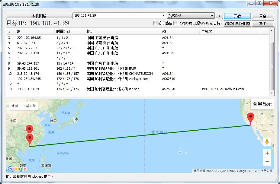 ===测试 [广州电信(天翼云)] 的回程路由=== Start: Sun Apr 15 13:50:07 2018 HOST: host.localdomain Loss% Snt Last Avg Best Wrst StDev 1.|-- ??? 100.0 10 0.0 0.0 0.0 0.0 0.0 2.|-- te-2-0-6.cr2.lax2.us.zenl 0.0% 10 2.5 3.1 2.0 8.0 1.6 3.|-- 192.254.84.244 0.0% 10 11.4 6.4 1.1 24.1 7.4 4.|-- 218.30.48.241 0.0% 10 1.3 1.3 1.1 1.4 0.0 5.|-- 59.43.182.106 0.0% 10 160.4 160.4 160.4 160.5 0.0 6.|-- 59.43.244.142 60.0% 10 153.0 153.0 153.0 153.1 0.0 7.|-- 202.97.91.138 20.0% 10 162.7 162.8 161.2 164.5 1.0 8.|-- 202.97.94.121 0.0% 10 156.6 158.1 155.2 161.7 2.1 9.|-- 183.61.221.49 0.0% 10 154.4 154.5 154.4 154.8 0.0 10.|-- 183.56.128.6 0.0% 10 164.6 164.2 163.9 164.9 0.0 11.|-- 14.215.116.1 0.0% 10 162.9 163.4 162.7 166.1 0.9 ===测试 [上海电信(天翼云)] 的回程路由=== Start: Sun Apr 15 13:50:25 2018 HOST: host.localdomain Loss% Snt Last Avg Best Wrst StDev 1.|-- ??? 100.0 10 0.0 0.0 0.0 0.0 0.0 2.|-- te-2-0-6.cr2.lax2.us.zenl 0.0% 10 2.8 3.0 1.9 5.7 0.9 3.|-- 192.254.84.244 0.0% 10 1.1 2.3 0.9 7.7 2.4 4.|-- 218.30.48.241 0.0% 10 1.3 1.3 1.0 1.5 0.0 5.|-- 59.43.248.130 0.0% 10 9.3 9.4 9.1 10.3 0.0 6.|-- 59.43.182.182 0.0% 10 127.2 130.2 127.2 143.2 6.2 7.|-- 59.43.244.122 30.0% 10 154.8 132.5 128.0 154.8 9.9 8.|-- 202.97.33.153 0.0% 10 127.8 127.8 127.7 128.0 0.0 9.|-- 202.97.94.238 0.0% 10 128.3 132.2 128.3 135.6 2.3 10.|-- 61.152.86.41 0.0% 10 130.2 130.8 129.1 132.7 0.9 11.|-- 124.74.166.18 60.0% 10 130.0 130.0 129.9 130.3 0.0 12.|-- 101.95.225.158 0.0% 10 129.6 129.5 129.4 129.6 0.0 13.|-- 101.227.255.45 0.0% 10 129.0 129.0 129.0 129.1 0.0 ===测试 [厦门电信CN2] 的回程路由=== Start: Sun Apr 15 13:50:58 2018 HOST: host.localdomain Loss% Snt Last Avg Best Wrst StDev 1.|-- ??? 100.0 10 0.0 0.0 0.0 0.0 0.0 2.|-- te-2-0-6.cr2.lax2.us.zenl 0.0% 10 2.2 2.6 1.7 5.8 1.1 3.|-- 192.254.84.244 0.0% 10 1.1 2.7 0.9 9.5 2.5 4.|-- 218.30.48.241 0.0% 10 1.2 1.3 1.2 1.5 0.0 5.|-- 59.43.182.106 0.0% 10 163.1 166.1 160.3 214.4 17.0 6.|-- 59.43.187.145 80.0% 10 162.2 162.2 162.1 162.2 0.0 7.|-- 59.43.130.161 0.0% 10 201.9 170.7 162.5 203.4 16.9 8.|-- 59.43.98.210 0.0% 10 164.9 164.9 164.9 165.0 0.0 9.|-- 27.148.195.54 0.0% 10 158.3 158.4 158.2 158.7 0.0 10.|-- 110.80.143.170 0.0% 10 162.7 161.6 160.7 165.2 1.2 11.|-- 117.25.156.126 30.0% 10 161.4 162.2 161.2 165.4 1.2 12.|-- 117.25.141.150 0.0% 10 161.6 164.2 160.4 173.5 5.1 13.|-- 117.28.254.129 0.0% 10 1141. 387.1 174.9 1141. 342.9 ===测试 [重庆联通] 的回程路由=== Start: Sun Apr 15 13:51:15 2018 HOST: host.localdomain Loss% Snt Last Avg Best Wrst StDev 1.|-- ??? 100.0 10 0.0 0.0 0.0 0.0 0.0 2.|-- te-2-0-6.cr2.lax2.us.zenl 0.0% 10 2.0 3.0 2.0 6.1 0.9 3.|-- 192.254.84.244 0.0% 10 0.9 1.1 0.9 1.2 0.0 4.|-- 192.254.81.49 0.0% 10 1.4 1.4 1.1 1.9 0.0 5.|-- 192.254.84.86 0.0% 10 1.0 1.1 0.9 1.3 0.0 6.|-- 199.102.95.6 0.0% 10 6.9 3.4 0.7 6.9 2.2 7.|-- 219.158.104.9 0.0% 10 169.6 163.3 158.2 169.6 4.1 8.|-- 219.158.3.137 0.0% 10 161.8 162.4 156.5 169.9 4.3 9.|-- 219.158.5.153 0.0% 10 165.8 165.5 161.4 173.9 3.6 10.|-- 219.158.12.70 0.0% 10 200.2 196.0 188.9 206.1 5.8 11.|-- 113.207.25.138 0.0% 10 198.6 189.6 184.4 198.6 5.0 12.|-- 58.144.255.26 20.0% 10 204.9 194.5 189.0 204.9 5.9 13.|-- 113.207.32.65 0.0% 10 196.7 203.0 189.4 220.9 8.9 ===测试 [上海移动] 的回程路由=== Start: Sun Apr 15 13:51:32 2018 HOST: host.localdomain Loss% Snt Last Avg Best Wrst StDev 1.|-- ??? 100.0 10 0.0 0.0 0.0 0.0 0.0 2.|-- te-2-0-6.cr2.lax2.us.zenl 0.0% 10 2.8 3.0 2.0 6.1 1.2 3.|-- 192.254.84.246 0.0% 10 4.1 1.6 0.8 4.1 1.2 4.|-- ae8.cr1-lax2.ip4.gtt.net 0.0% 10 0.5 1.8 0.5 11.1 3.2 5.|-- xe-7-2-1.cr1-lax1.ip4.gtt 0.0% 10 0.6 0.6 0.5 0.7 0.0 6.|-- ip4.gtt.net 0.0% 10 1.2 1.5 0.9 3.4 0.7 7.|-- 223.120.6.217 0.0% 10 1.3 1.2 0.9 1.9 0.0 8.|-- 223.120.12.18 10.0% 10 196.7 181.2 176.3 196.7 7.0 9.|-- 221.183.55.50 0.0% 10 180.7 181.3 179.5 191.1 3.5 10.|-- 221.183.25.193 10.0% 10 179.5 192.3 179.5 253.4 24.9 11.|-- 221.183.23.37 0.0% 10 157.1 153.2 152.0 157.1 1.5 12.|-- 221.183.13.150 70.0% 10 152.9 152.7 152.7 152.9 0.0 13.|-- . 20.0% 10 153.5 153.8 153.5 154.0 0.0 14.|-- . 0.0% 10 160.7 157.5 156.3 160.7 1.2 15.|-- . 0.0% 10 153.8 159.2 153.8 165.9 4.2